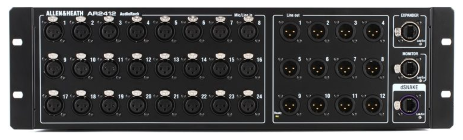 The Allen & Heath GLD-AR2412 is the Main AudioRack for the company's GLD digital mixing system. The GLD-AR2412 includes 24 XLR inputs and 12 XLR outputs and connects to the GLD-80 digital mixer via inexpensive and readily available Cat 5 cable running Allen & Heath's dSNAKE protocol, allowing the GLD-AR2412 to be positioned up to 400' from the GLD-80. dSNAKE provides control to the remote mic preamps in the GLD-AR2412; all are scene recallable. For larger configurations, a GLD-AR84 Expander AudioRack may be connected to the GLD-AR2412 to add an additional eight XLR inputs and 4 XLR outputs.